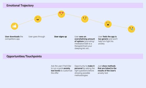 After creating Joe, I’ve traced his emotional trajectory (User Journey) while using the current apps in the market that offer anxiety-relief methodologies and this helped me target the opportunities and touch-points to create my unique selling point.